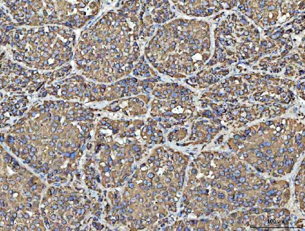 Porin/VDAC1 was detected in a paraffin-embedded section of human liver cancer tissue. The tissue section was developed using HRP Conjugated Rabbit IgG Super Vision Assay Kit (Catalog # SV0002) with DAB (Catalog # AR1027) as the chromogen.