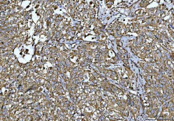Porin/VDAC1 was detected in a paraffin-embedded section of human urothelial carcinoma with squamous differentiation tissue. The tissue section was developed using HRP Conjugated Rabbit IgG Super Vision Assay Kit (Catalog # SV0002) with DAB (Catalog # AR1027) as the chromogen.