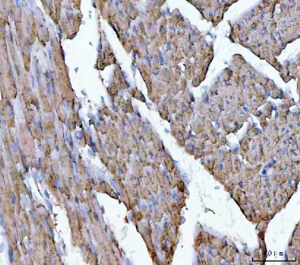 Porin/VDAC1 was detected in a paraffin-embedded section of rat heart tissue. The tissue section was developed using HRP Conjugated Rabbit IgG Super Vision Assay Kit (Catalog # SV0002) with DAB (Catalog # AR1027) as the chromogen.