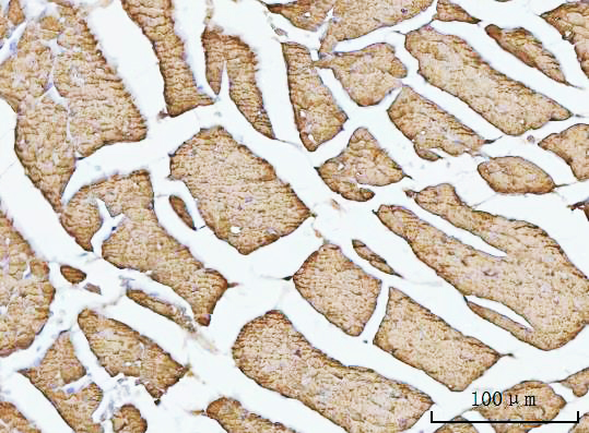 Porin/VDAC1 was detected in a paraffin-embedded section of mouse cardiac muscle tissue. The tissue section was developed using HRP Conjugated Rabbit IgG Super Vision Assay Kit (Catalog # SV0002) with DAB (Catalog # AR1027) as the chromogen.