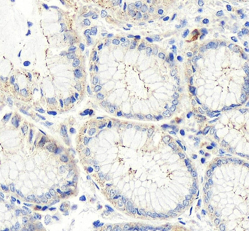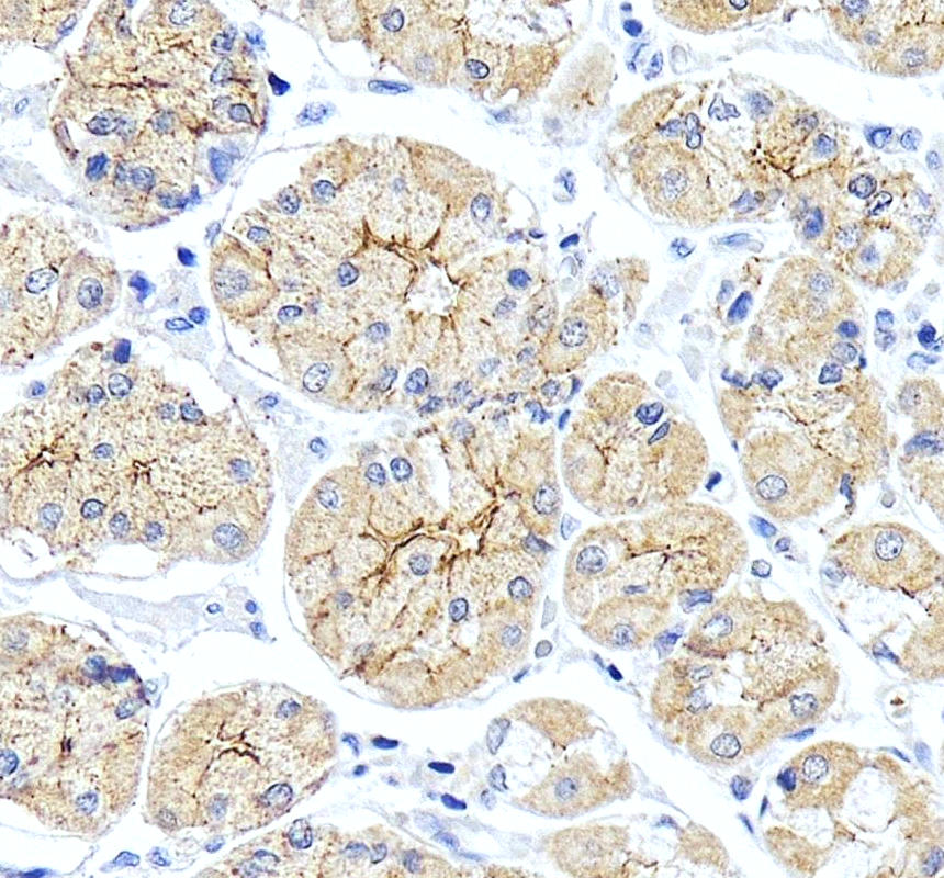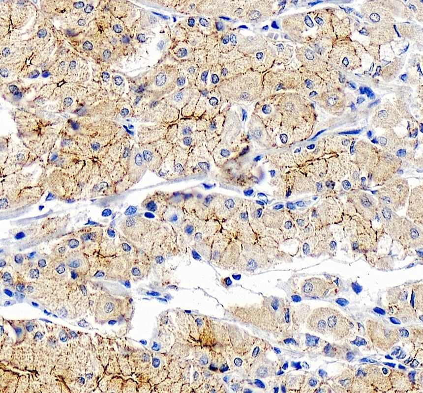 Occludin/OCLN was detected in a paraffin-embedded section of human stomach tissue. The tissue section was incubated with rabbit anti-Occludin/OCLN Antibody (A01246-4) at a dilution of 1:200 and developed using HRP Conjugated Rabbit IgG Super Vision Assay Kit (Catalog # SV0002) with DAB (Catalog # AR1027) as the chromogen.