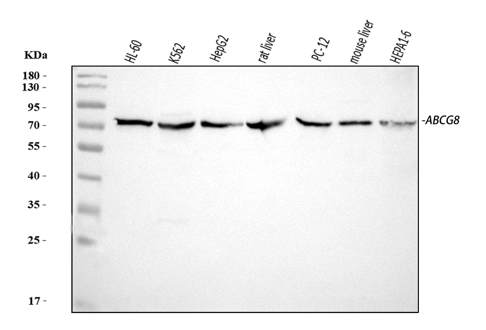 Western blot analysis of ABCG8 using anti-ABCG8 antibody (A01482-1). The sample well of each lane was loaded with 30 ug of sample under reducing conditions.