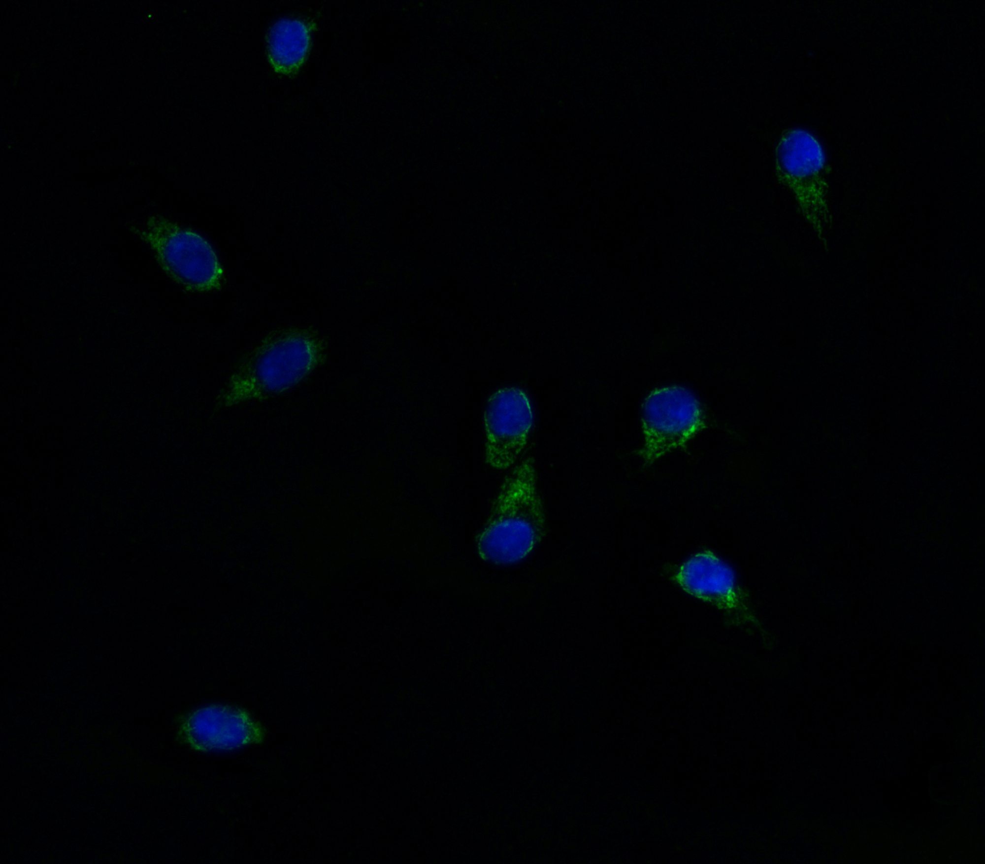 ABCG8 was detected in an immunocytochemical section of HepG2 cells. The section was incubated with rabbit anti-ABCG8 Antibody (A01482-1) at a dilution of 1:100. Fluoro488 Conjugated Goat Anti-Rabbit IgG (Green) (Catalog # BA1127) was used as secondary antibody. The section was counterstained with DAPI (Catalog # AR1176) (Blue).