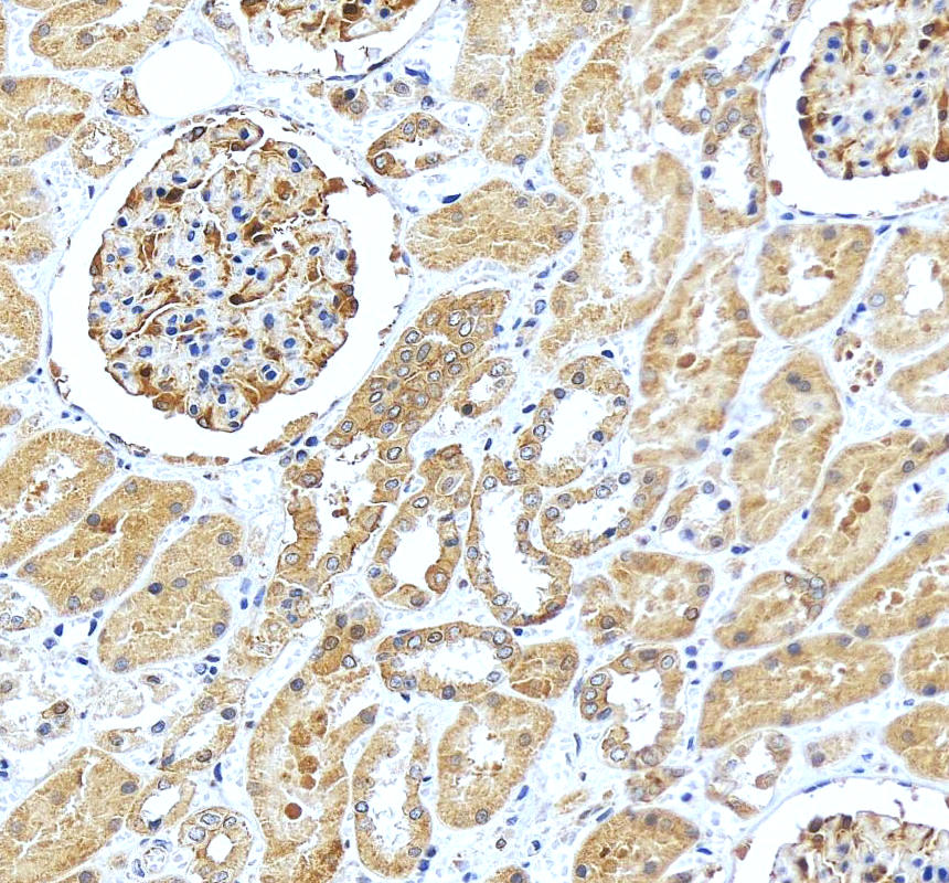 CD2AP was detected in a paraffin-embedded section of mouse kidney tissue. The tissue section was incubated with rabbit anti-CD2AP Antibody (A01756-2) at a dilution of 1:200 and developed using HRP Conjugated Rabbit IgG Super Vision Assay Kit (Catalog # SV0002) with DAB (Catalog # AR1027) as the chromogen.