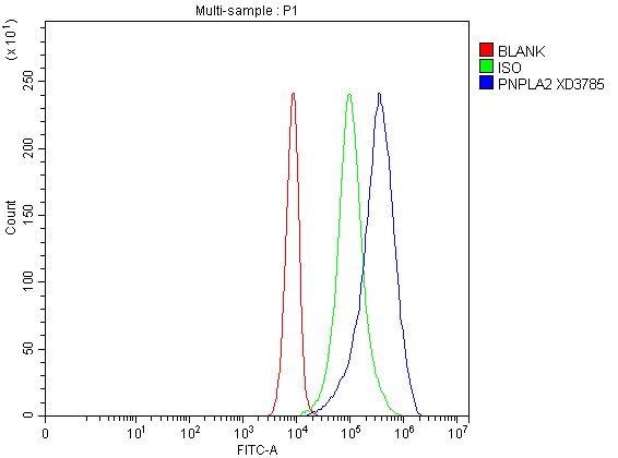 Overlay histogram showing A431 cells stained with A01800-1 (Blue line). The cells were fixed with 4% paraformaldehyde and blocked with 10% normal goat serum. And then incubated with rabbit anti-PNPLA2 Antibody (A01800-1) at 1:100 dilution for 30 min at 20°C. Fluoro488 conjugated goat anti-rabbit IgG (BA1127) was used as secondary antibody at 1:100 dilution for 30 minutes at 20°C. Isotype control antibody (Green line) was rabbit IgG at 1:100 dilution used under the same conditions. Unlabelled sample without incubation with primary antibody and secondary antibody (Red line) was used as a blank control.