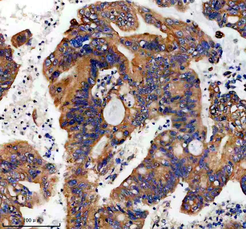 PNPLA2 was detected in a paraffin-embedded section of human colon cancer tissue. The tissue section was incubated with rabbit anti-PNPLA2 Antibody (A01800-1) at a dilution of 1:200 and developed using HRP Conjugated Rabbit IgG Super Vision Assay Kit (Catalog # SV0002) with DAB (Catalog # AR1027) as the chromogen.