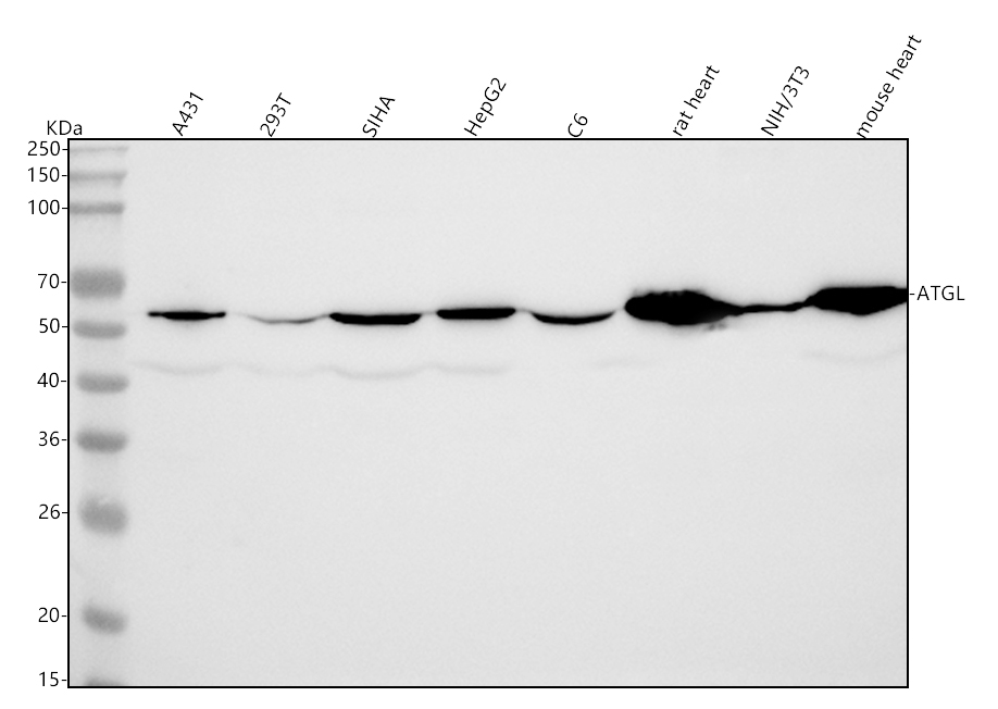 Western blot analysis of PNPLA2 using anti-PNPLA2 antibody (A01800-1). The sample well of each lane was loaded with 30 ug of sample under reducing conditions.