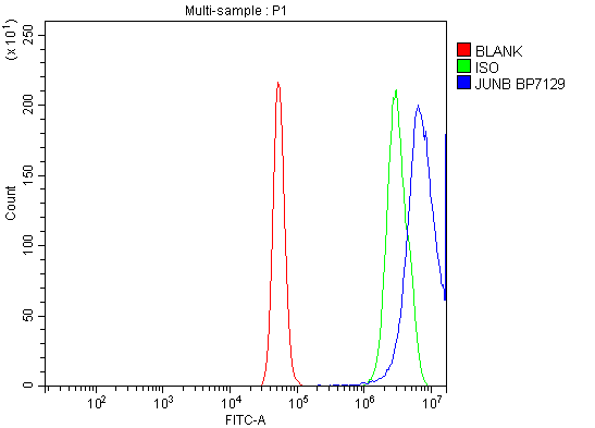 Overlay histogram showing A431 cells stained with A01825-3 (Blue line). To facilitate intracellular staining, cells were fixed with 4% paraformaldehyde and permeabilized with permeabilization buffer. The cells were blocked with 10% normal goat serum. And then incubated with rabbit anti-JUNB Antibody (A01825-3) at 1:100 dilution for 30 min at 20°C. Fluoro488 conjugated goat anti-rabbit IgG (BA1127) was used as secondary antibody at 1:100 dilution for 30 minutes at 20°C. Isotype control antibody (Green line) was rabbit IgG at 1:100 dilution used under the same conditions. Unlabelled sample without incubation with primary antibody and secondary antibody (Red line) was used as a blank control.