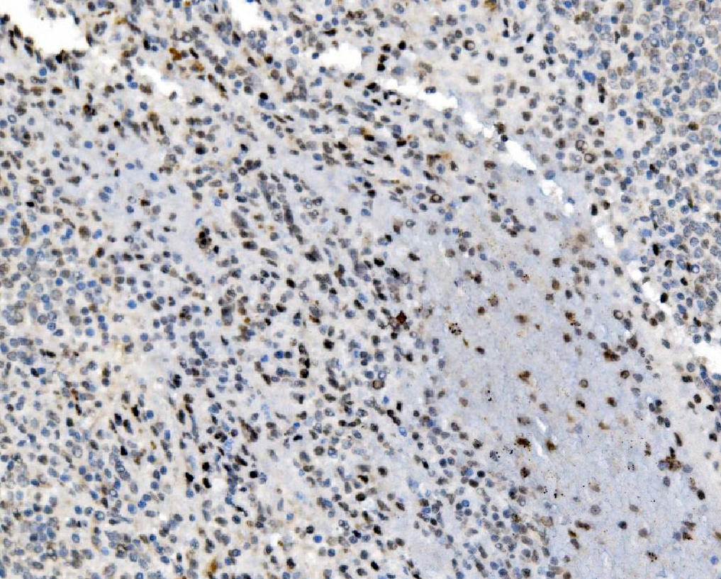 JUNB was detected in a paraffin-embedded section of human spleen tissue. Biotinylated goat anti-rabbit IgG was used as secondary antibody. The tissue section was incubated with rabbit anti-JUNB Antibody (A01825-3) at a dilution of 1:200 and developed using Strepavidin-Biotin-Complex (SABC) (Catalog # SA1022) with DAB (Catalog # AR1027) as the chromogen.
