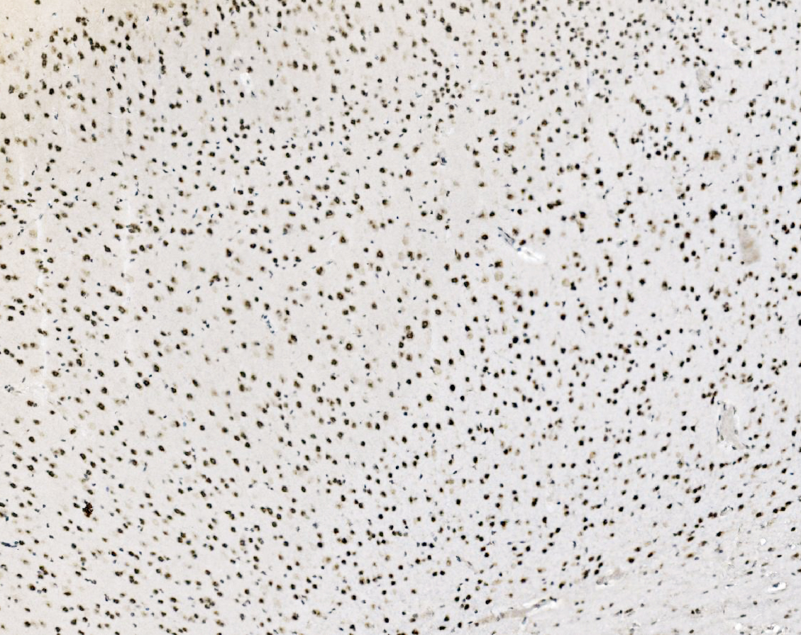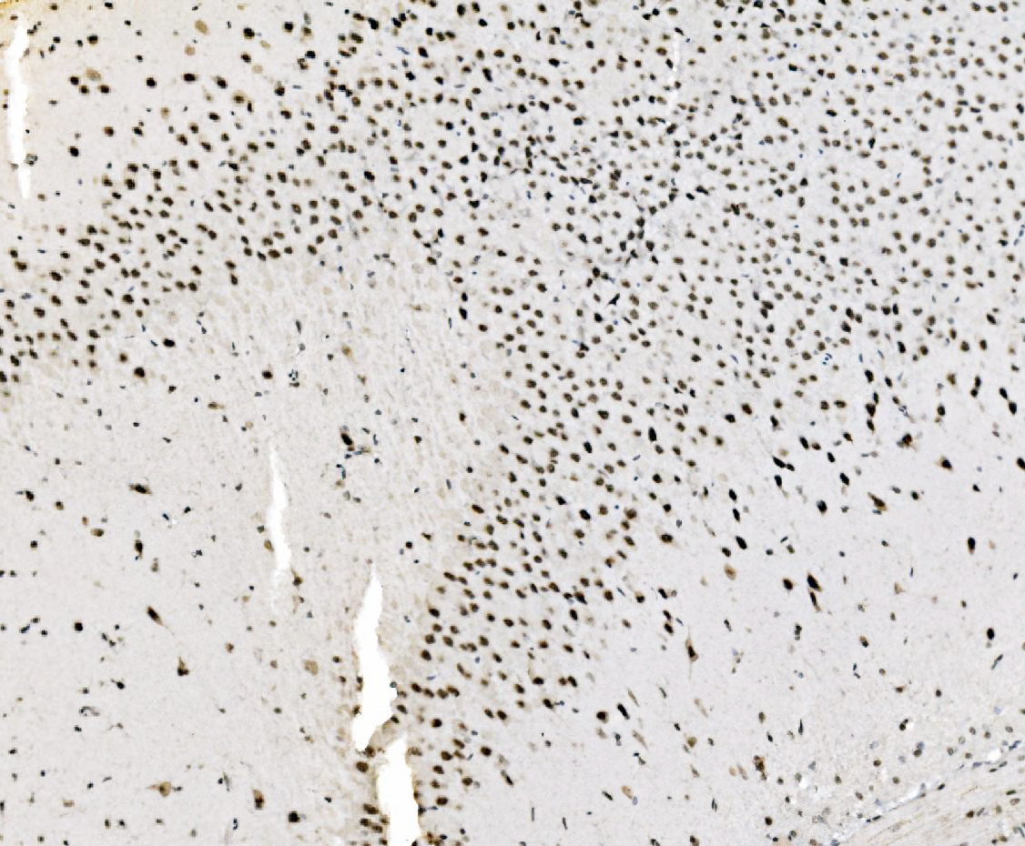JUNB was detected in a paraffin-embedded section of mouse brain tissue. Biotinylated goat anti-rabbit IgG was used as secondary antibody. The tissue section was incubated with rabbit anti-JUNB Antibody (A01825-3) at a dilution of 1:200 and developed using Strepavidin-Biotin-Complex (SABC) (Catalog # SA1022) with DAB (Catalog # AR1027) as the chromogen.