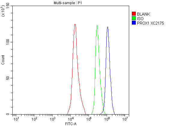 Overlay histogram showing SH-SY5Y cells stained with A01985-1 (Blue line). To facilitate intracellular staining, cells were fixed with 4% paraformaldehyde and permeabilized with permeabilization buffer. The cells were blocked with 10% normal goat serum. And then incubated with rabbit anti-PROX1 Antibody (A01985-1) at 1:100 dilution for 30 min at 20°C. Fluoro488 conjugated goat anti-rabbit IgG (BA1127) was used as secondary antibody at 1:100 dilution for 30 minutes at 20°C. Isotype control antibody (Green line) was rabbit IgG at 1:100 dilution used under the same conditions. Unlabelled sample without incubation with primary antibody and secondary antibody (Red line) was used as a blank control.