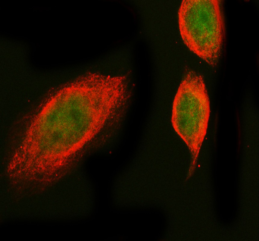 PROX1 was detected in an immunocytochemical section of SiHa cells. The section was incubated with rabbit anti-PROX1 Antibody (A01985-1) at a dilution of 1:100. Fluoro488-conjugated Anti-rabbit IgG Secondary Antibody (green) (Catalog # BA1127) and Fluoro594-conjugated Anti-mouse IgG Secondary Antibody (red) (Catalog # BA1141) were used as secondary antibody.