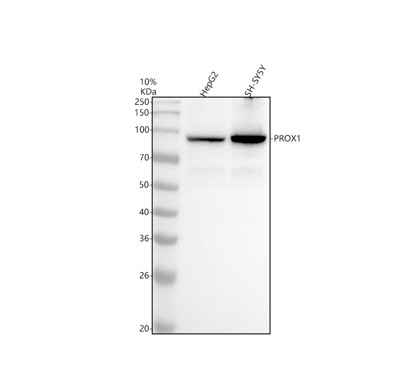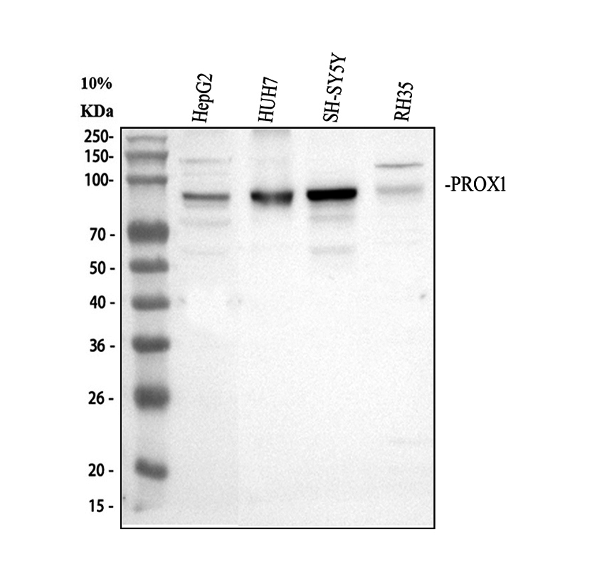 Western blot analysis of PROX1 using anti-PROX1 antibody (A01985-1). The sample well of each lane was loaded with 30 ug of sample under reducing conditions.