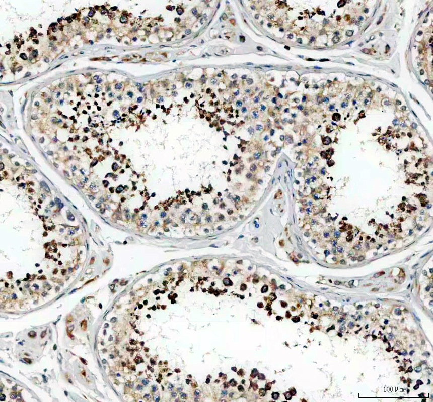 GPX4 was detected in a paraffin-embedded section of human testis tissue. The tissue section was incubated with rabbit anti-GPX4 Antibody (A02059-1) at a dilution of 1:200 and developed using HRP Conjugated Rabbit IgG Super Vision Assay Kit (Catalog # SV0002) with DAB (Catalog # AR1027) as the chromogen.