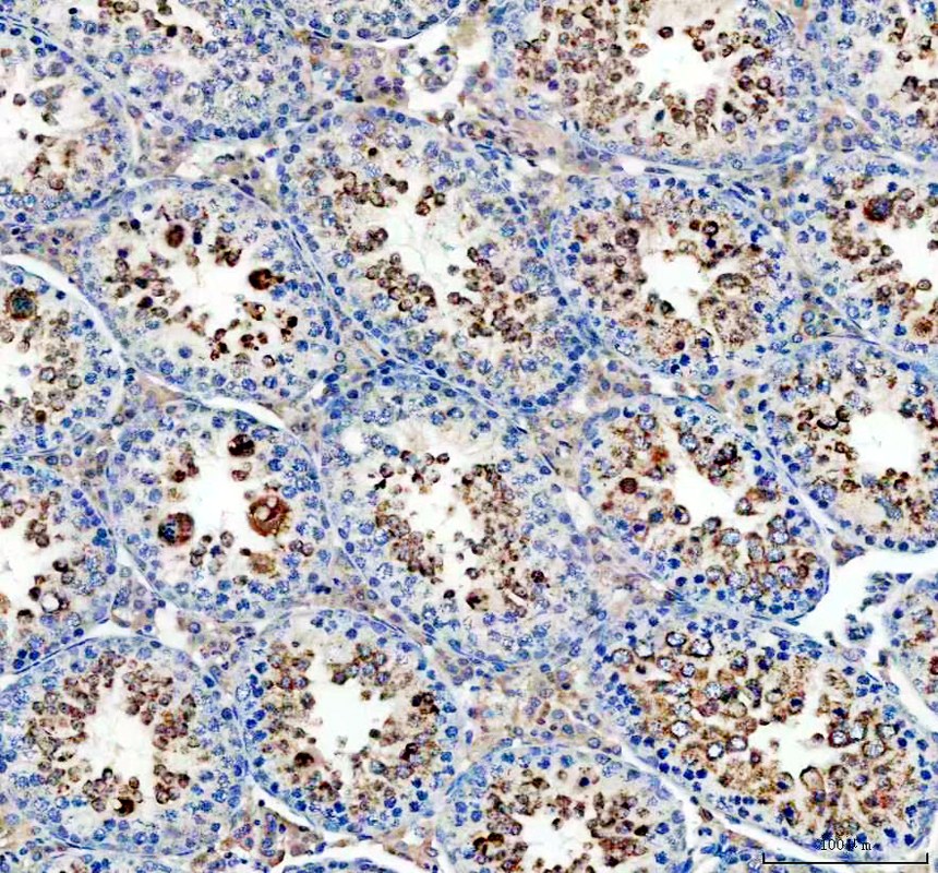 GPX4 was detected in a paraffin-embedded section of mouse testis tissue. The tissue section was incubated with rabbit anti-GPX4 Antibody (A02059-1) at a dilution of 1:200 and developed using HRP Conjugated Rabbit IgG Super Vision Assay Kit (Catalog # SV0002) with DAB (Catalog # AR1027) as the chromogen.