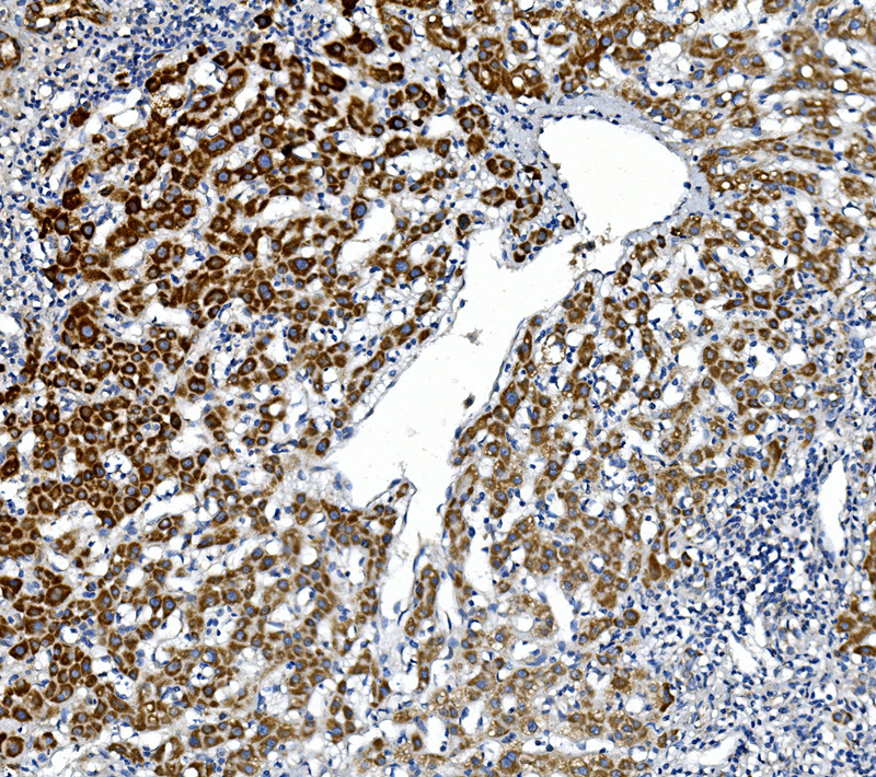 GPNMB was detected in a paraffin-embedded section of human liver cancer tissue. Biotinylated goat anti-rabbit IgG was used as secondary antibody. The tissue section was incubated with rabbit anti-GPNMB Antibody (A02439-1) at a dilution of 1:200 and developed using Strepavidin-Biotin-Complex (SABC) (Catalog # SA1022) with DAB (Catalog # AR1027) as the chromogen.