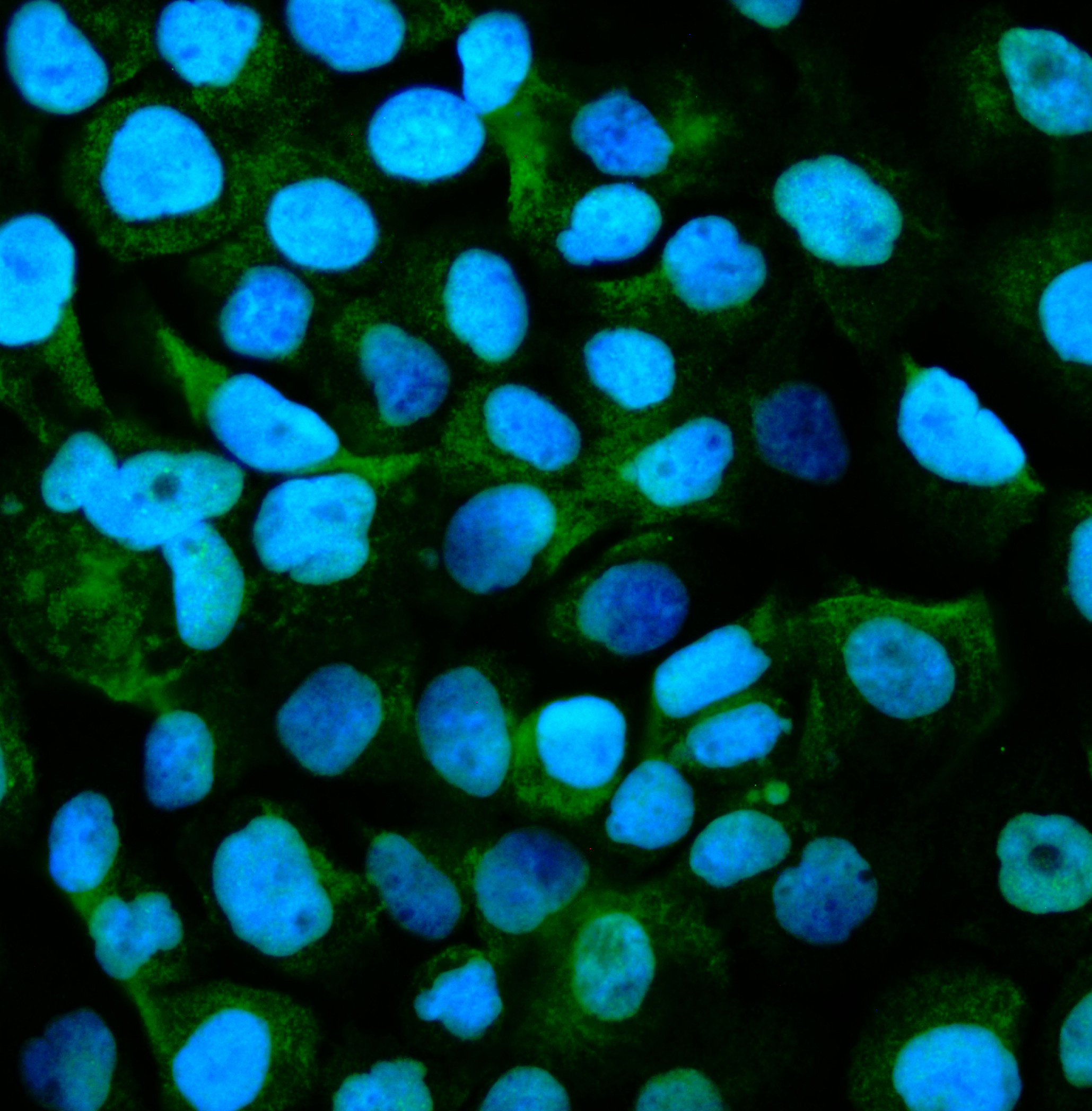GPNMB was detected in an immunocytochemical section of A431 cells. The section was incubated with rabbit anti-GPNMB Antibody (A02439-1) at a dilution of 1:100. Fluoro488 Conjugated Goat Anti-Rabbit IgG (Green) (Catalog # BA1127) was used as secondary antibody. The section was counterstained with DAPI (Catalog # AR1176) (Blue).