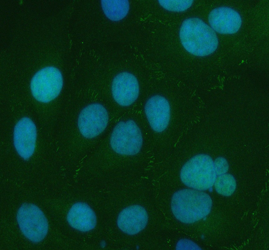 CXADR was detected in an immunocytochemical section of U2OS cells. The section was incubated with rabbit anti-CXADR Antibody (A02747-1) at a dilution of 1:100. Fluoro488 Conjugated Goat Anti-Rabbit IgG (Green) (Catalog # BA1127) was used as secondary antibody. The section was counterstained with DAPI (Catalog # AR1176) (Blue).