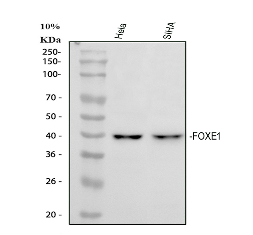 Western blot analysis of FOXE1 using anti-FOXE1 antibody (A02831-5). The sample well of each lane was loaded with 30 ug of sample under reducing conditions.