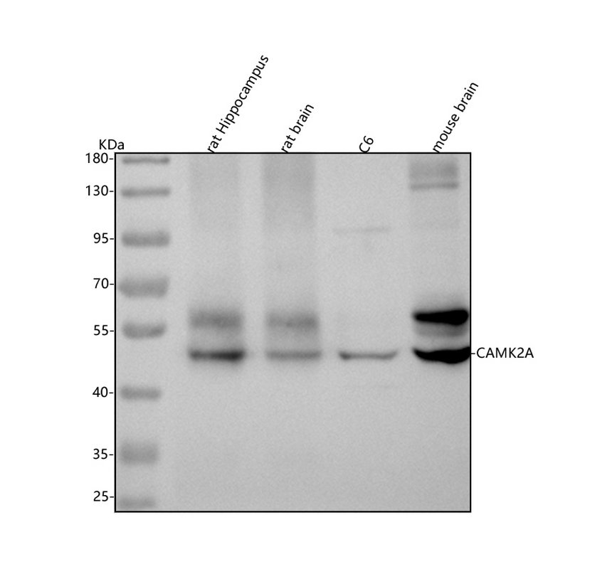 Western blot analysis of CaMKII Alpha/CAMK2A using anti-CaMKII Alpha/CAMK2A antibody (A03241-1). The sample well of each lane was loaded with 30 ug of sample under reducing conditions.