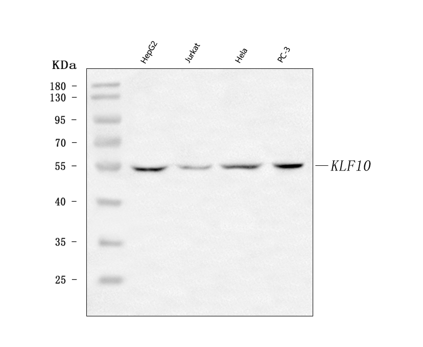 Western blot analysis of KLF10 using anti-KLF10 antibody (A03419-2). The sample well of each lane was loaded with 30 ug of sample under reducing conditions.