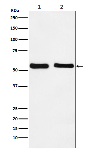 After electrophoresis, proteins were transferred to a membrane. Then the membrane was incubated with rabbit anti-KLF10 antigen affinity purified polyclonal antibody (A03419-2) at a dilution of 1:1000 and probed with a goat anti-rabbit IgG-HRP secondary antibody (Catalog # BA1054). The signal is developed using ECL Plus Western Blotting Substrate (Catalog # AR1197). A specific band was detected for KLF10 at approximately 53 kDa. The expected band size for KLF10 is at 53 kDa.