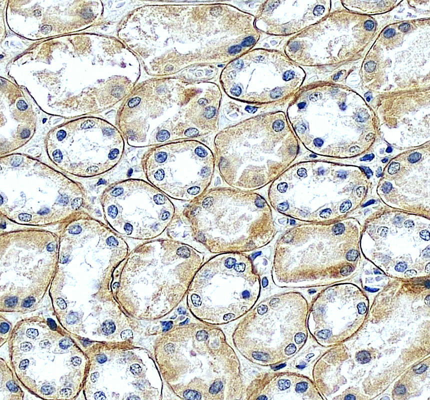 LAMC1/LAMC2/LAMC3 was detected in a paraffin-embedded section of human kidney tissue. The tissue section was incubated with rabbit anti-LAMC1/LAMC2/LAMC3 Antibody (A03522) at a dilution of 1:200 and developed using HRP Conjugated Rabbit IgG Super Vision Assay Kit (Catalog # SV0002) with DAB (Catalog # AR1027) as the chromogen.