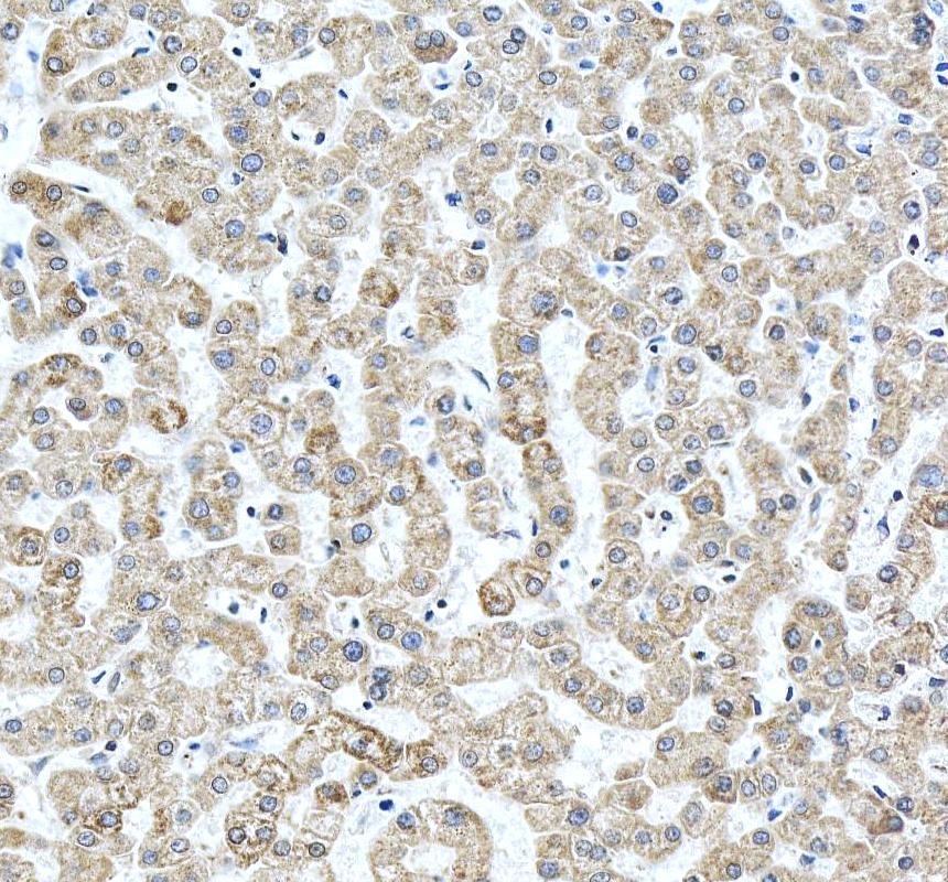 Cytochrome c/CYCS was detected in a paraffin-embedded section of human liver tissue. The tissue section was incubated with rabbit anti-Cytochrome c/CYCS Antibody (A03529) at a dilution of 1:200 and developed using HRP Conjugated Rabbit IgG Super Vision Assay Kit (Catalog # SV0002) with DAB (Catalog # AR1027) as the chromogen.