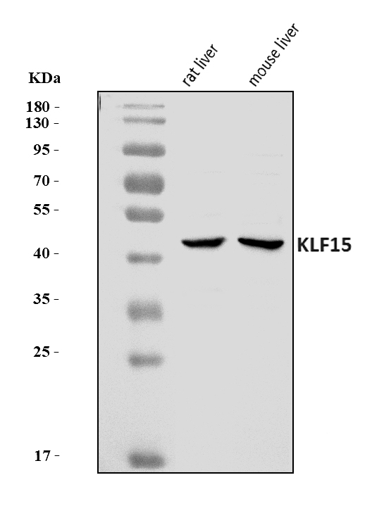 After electrophoresis, proteins were transferred to a membrane. Then the membrane was incubated with rabbit anti-KLF15 antigen affinity purified polyclonal antibody (A03661-1) at a dilution of 1:1000 and probed with a goat anti-rabbit IgG-HRP secondary antibody (Catalog # BA1054). The signal is developed using ECL Plus Western Blotting Substrate (Catalog # AR1197). A specific band was detected for KLF15 at approximately 44 kDa. The expected band size for KLF15 is at 44 kDa.