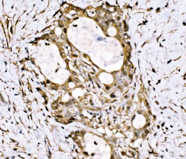 KLF15 was detected in a paraffin-embedded section of human Gall bladder adenosquamous carcinoma tissue. Biotinylated goat anti-rabbit IgG was used as secondary antibody. The tissue section was incubated with rabbit anti-KLF15 Antibody (A03661-1) at a dilution of 1:200 and developed using Strepavidin-Biotin-Complex (SABC) (Catalog # SA1022) with DAB (Catalog # AR1027) as the chromogen.