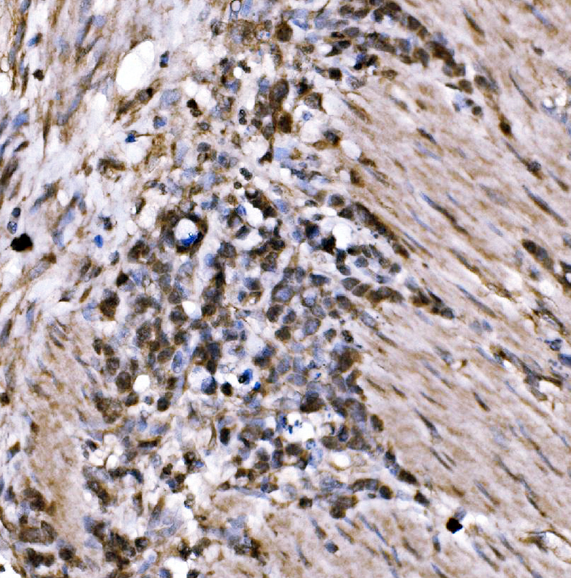 KLF15 was detected in a paraffin-embedded section of human gastric cancer tissue. Biotinylated goat anti-rabbit IgG was used as secondary antibody. The tissue section was incubated with rabbit anti-KLF15 Antibody (A03661-1) at a dilution of 1:200 and developed using Strepavidin-Biotin-Complex (SABC) (Catalog # SA1022) with DAB (Catalog # AR1027) as the chromogen.