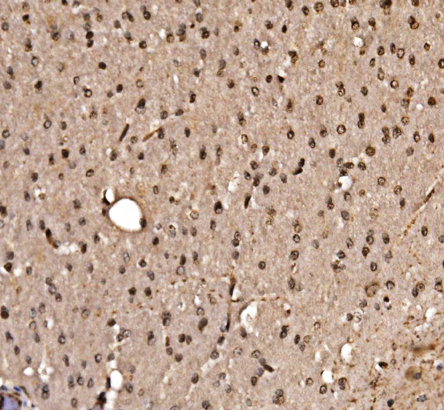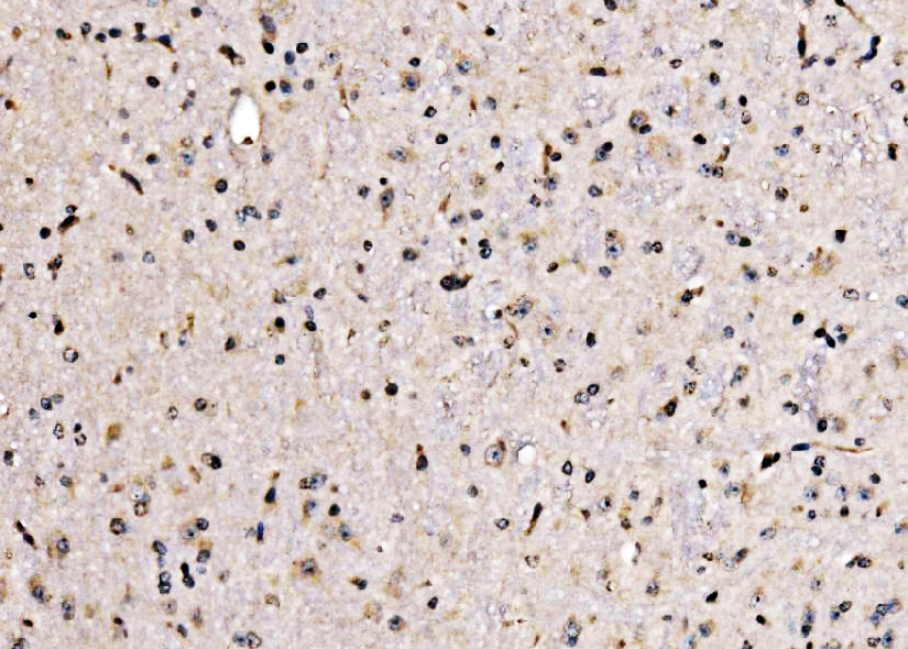 KLF15 was detected in a paraffin-embedded section of mouse brain tissue. Biotinylated goat anti-rabbit IgG was used as secondary antibody. The tissue section was incubated with rabbit anti-KLF15 Antibody (A03661-1) at a dilution of 1:200 and developed using Strepavidin-Biotin-Complex (SABC) (Catalog # SA1022) with DAB (Catalog # AR1027) as the chromogen.
