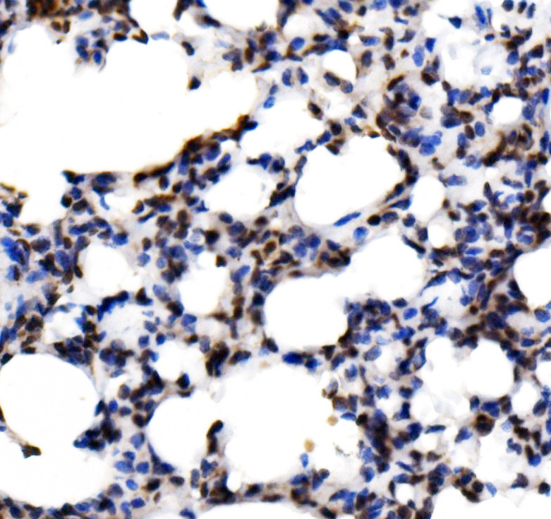 KLF15 was detected in a paraffin-embedded section of rat lung tissue. Biotinylated goat anti-rabbit IgG was used as secondary antibody. The tissue section was incubated with rabbit anti-KLF15 Antibody (A03661-1) at a dilution of 1:200 and developed using Strepavidin-Biotin-Complex (SABC) (Catalog # SA1022) with DAB (Catalog # AR1027) as the chromogen.