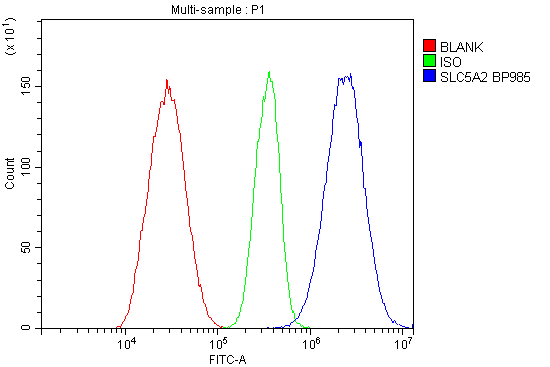 Overlay histogram showing HepG2 cells stained with A03748-1 (Blue line).. And then incubated with rabbit anti-SLC5A2 Antibody (A03748-1, 1:100) for 30 min at 20°C. Fluoro488 conjugated goat anti-rabbit IgG (BA1127, 1:100) was used as secondary antibody Isotype control antibody (Green line) was rabbit IgG (1:100) used under the same conditions. Unlabelled sample (Red line) was also used as a control.