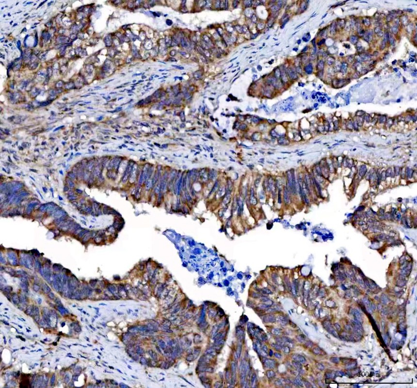 EPHB3 was detected in a paraffin-embedded section of human colon cancer tissue. The tissue section was incubated with rabbit anti-EPHB3 Antibody (A04659) at a dilution of 1:200 and developed using HRP Conjugated Rabbit IgG Super Vision Assay Kit (Catalog # SV0002) with DAB (Catalog # AR1027) as the chromogen.