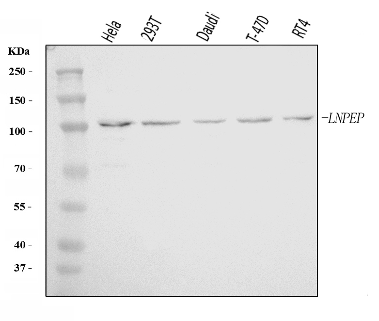 Western blot analysis of LNPEP using anti-LNPEP antibody (A05092-1). The sample well of each lane was loaded with 30 ug of sample under reducing conditions.