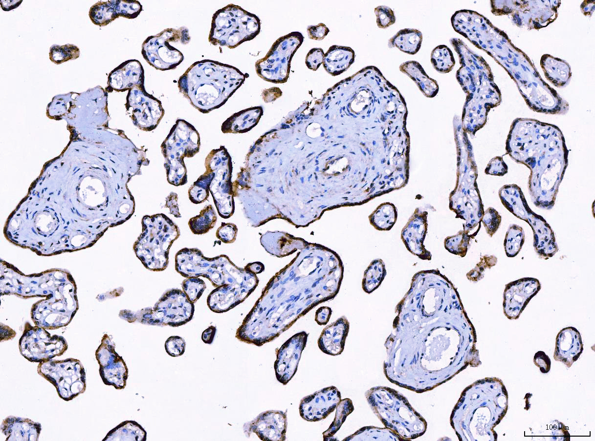 LNPEP was detected in a paraffin-embedded section of human placenta tissue. The tissue section was incubated with rabbit anti-LNPEP Antibody (A05092-1) at a dilution of 1:200 and developed using HRP Conjugated Rabbit IgG Super Vision Assay Kit (Catalog # SV0002) with DAB (Catalog # AR1027) as the chromogen.