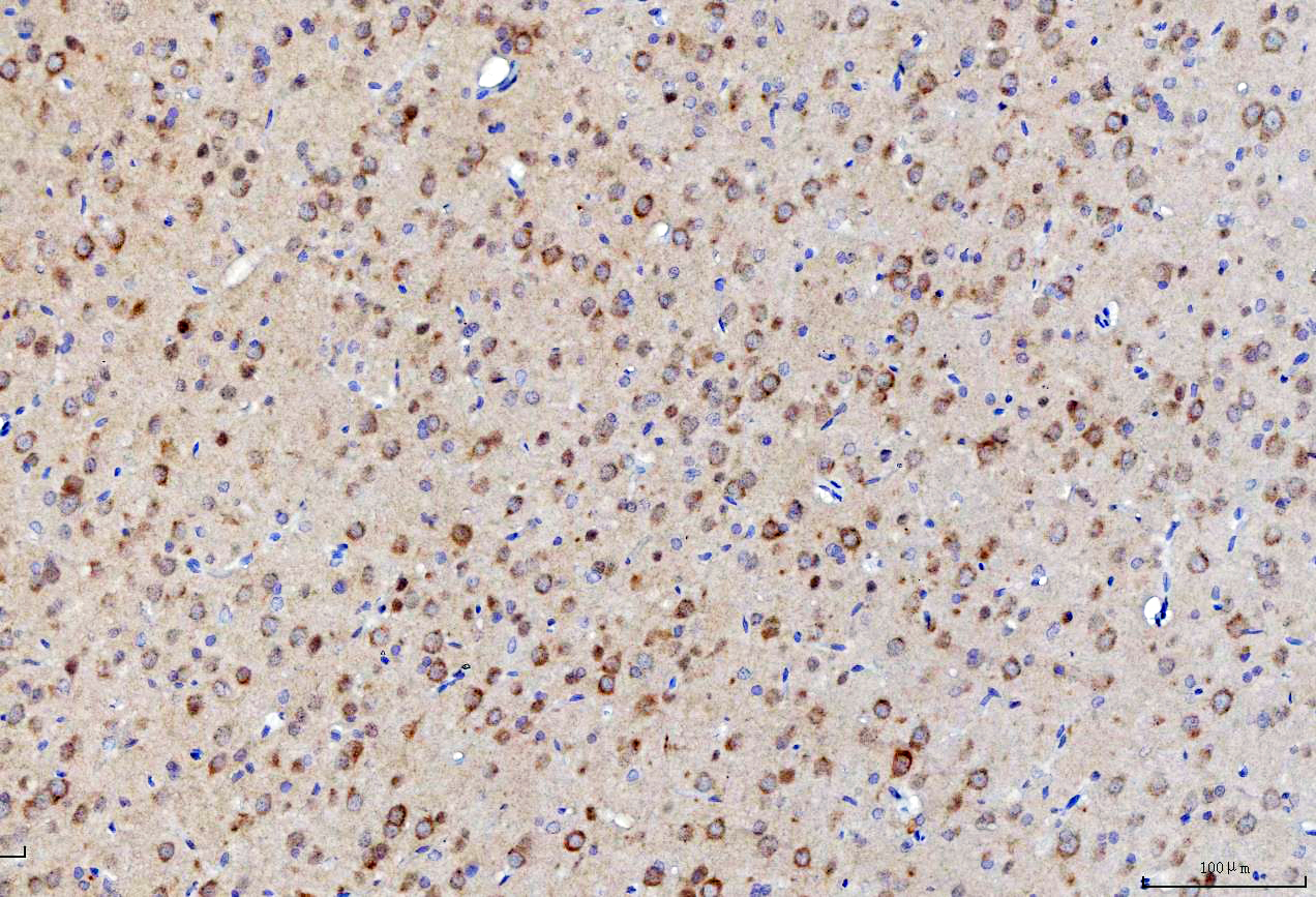 LNPEP was detected in a paraffin-embedded section of mouse brain tissue. The tissue section was incubated with rabbit anti-LNPEP Antibody (A05092-1) at a dilution of 1:200 and developed using HRP Conjugated Rabbit IgG Super Vision Assay Kit (Catalog # SV0002) with DAB (Catalog # AR1027) as the chromogen.