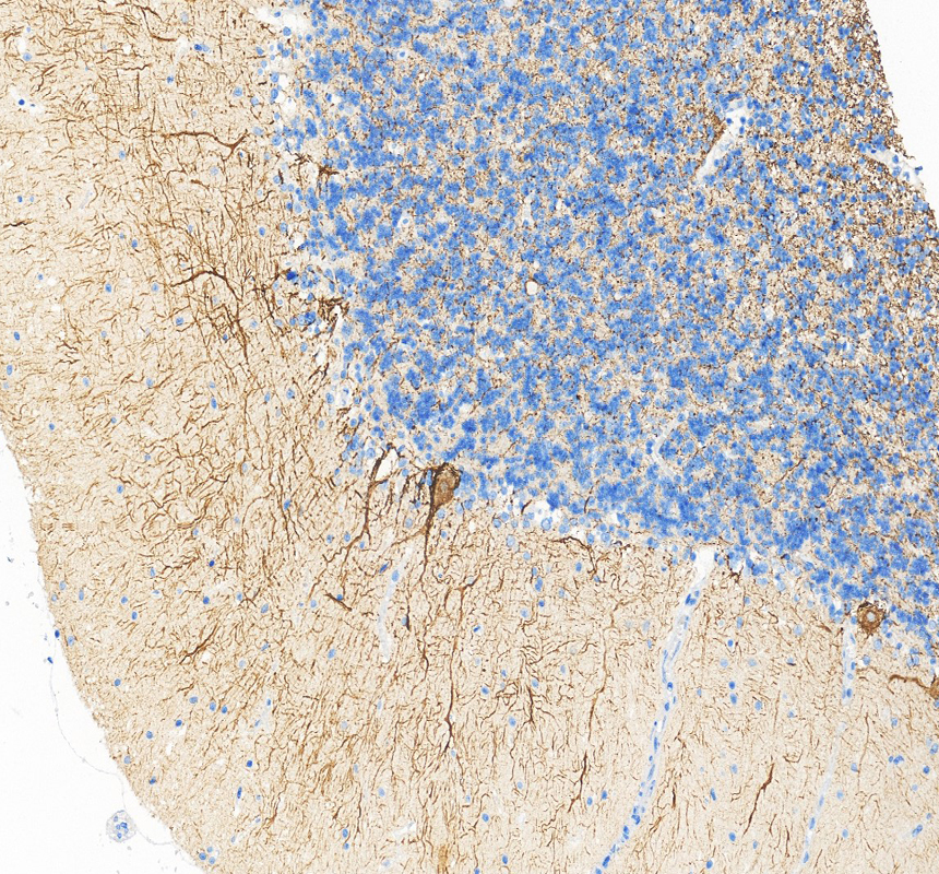 NF-H/NF200/NEFH was detected in a paraffin-embedded section of human cerebellum tissue. The tissue section was incubated with rabbit anti-NF-H/NF200/NEFH Antibody (A05307) at a dilution of 1:200 and developed using HRP Conjugated Rabbit IgG Super Vision Assay Kit (Catalog # SV0002) with DAB (Catalog # AR1027) as the chromogen.