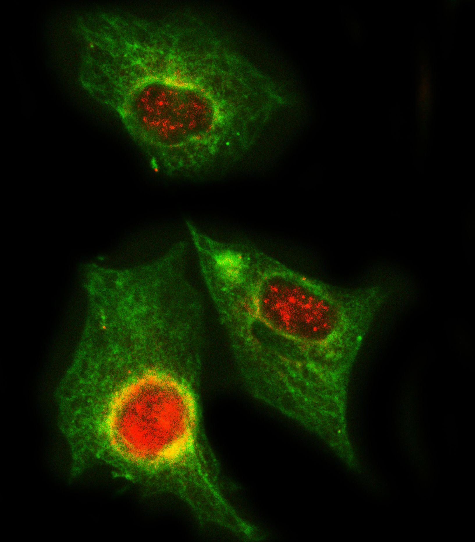 PPP2R5A was detected in an immunocytochemical section of A549 cells. Cy3-conjugated Anti-rabbit IgG Secondary Antibody (red)(Catalog#BA1032) and Fluoro488-conjugated Anti-mouse IgG Secondary Antibody (Green) (Catalog # BA1126) were used as secondary antibody.
