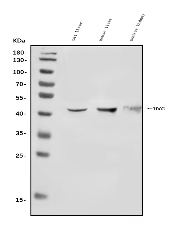 Western blot analysis of IDO2 using anti-IDO2 antibody (A06002-2). The sample well of each lane was loaded with 30 ug of sample under reducing conditions.