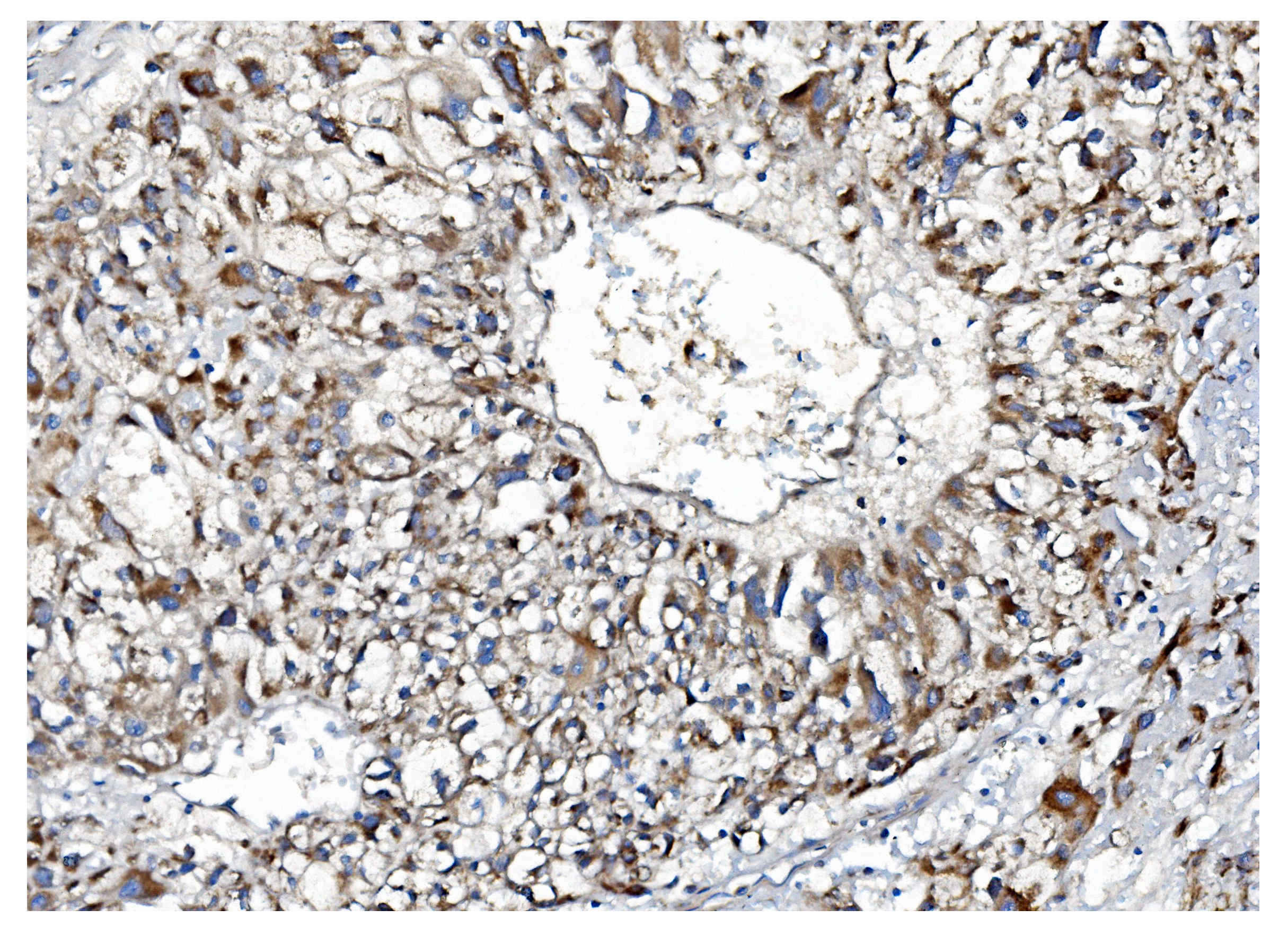 IDO2 was detected in a paraffin-embedded section of human liver cancer tissue. Biotinylated goat anti-rabbit IgG was used as secondary antibody. The tissue section was incubated with rabbit anti-IDO2 Antibody (A06002-2) at a dilution of 1:200 and developed using Strepavidin-Biotin-Complex (SABC) (Catalog # SA1022) with DAB (Catalog # AR1027) as the chromogen.