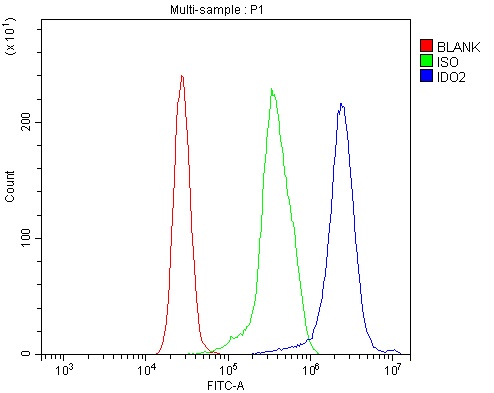 Overlay histogram showing K562 cells stained with A06002-2 (Blue line). To facilitate intracellular staining, cells were fixed with 4% paraformaldehyde and permeabilized with permeabilization buffer. The cells were blocked with 10% normal goat serum. And then incubated with rabbit anti-IDO2 Antibody (A06002-2) at 1:100 dilution for 30 min at 20°C. Fluoro488 conjugated goat anti-rabbit IgG (BA1127) was used as secondary antibody at 1:100 dilution for 30 minutes at 20°C. Isotype control antibody (Green line) was rabbit IgG at 1:100 dilution used under the same conditions. Unlabelled sample without incubation with primary antibody and secondary antibody (Red line) was used as a blank control.