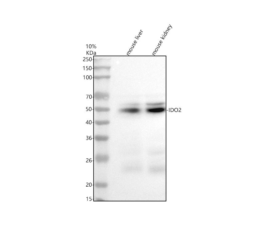 After electrophoresis, proteins were transferred to a membrane. Then the membrane was incubated with rabbit anti-IDO2 antigen affinity purified polyclonal antibody (A06002-2) at a dilution of 1:1000 and probed with a goat anti-rabbit IgG-HRP secondary antibody (Catalog # BA1054). The signal is developed using ECL Plus Western Blotting Substrate (Catalog # AR1197). A specific band was detected for IDO2 at approximately 45 kDa. The expected band size for IDO2 is at 45 kDa.