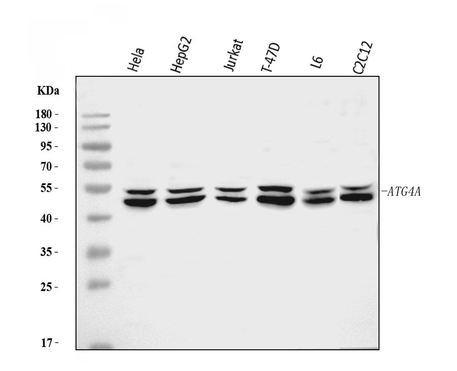 Western blot analysis of ATG4A using anti-ATG4A antibody (A06539-3). The sample well of each lane was loaded with 30 ug of sample under reducing conditions.