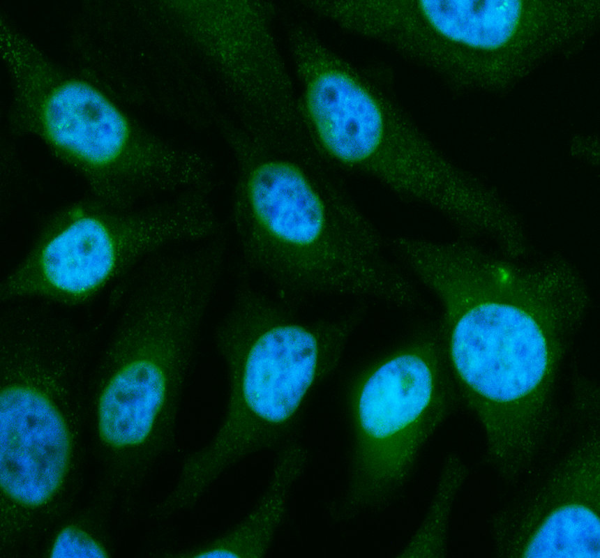 ACAA1 was detected in an immunocytochemical section of Hela cells. The section was incubated with rabbit anti-ACAA1 Antibody (A07559-4) at a dilution of 1:100. Fluoro488 Conjugated Goat Anti-Rabbit IgG (Green) (Catalog # BA1127) was used as secondary antibody. The section was counterstained with DAPI (Catalog # AR1176) (Blue).