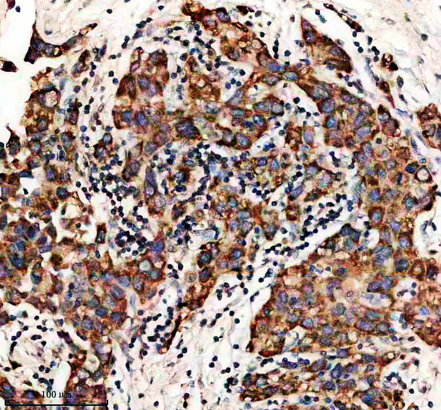ACAA1 was detected in a paraffin-embedded section of human liver cancer tissue. The tissue section was incubated with rabbit anti-ACAA1 Antibody (A07559-4) at a dilution of 1:200 and developed using HRP Conjugated Rabbit IgG Super Vision Assay Kit (Catalog # SV0002) with DAB (Catalog # AR1027) as the chromogen.