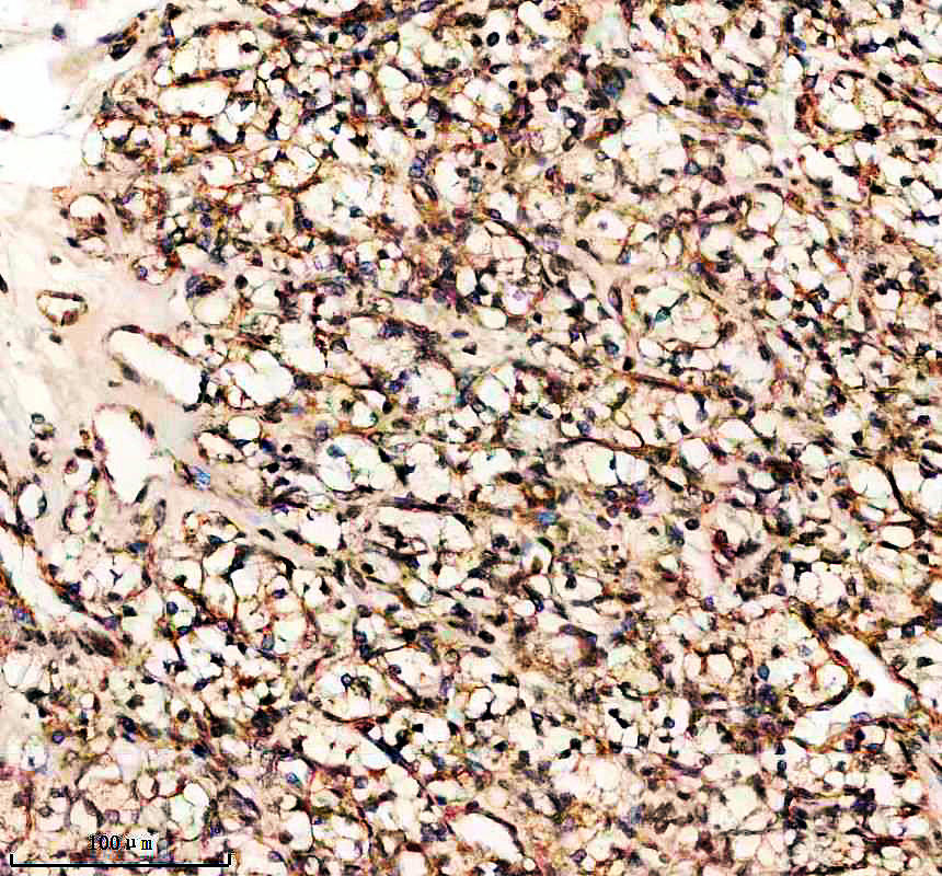 ACAA1 was detected in a paraffin-embedded section of human renal cancer tissue. The tissue section was incubated with rabbit anti-ACAA1 Antibody (A07559-4) at a dilution of 1:200 and developed using HRP Conjugated Rabbit IgG Super Vision Assay Kit (Catalog # SV0002) with DAB (Catalog # AR1027) as the chromogen.