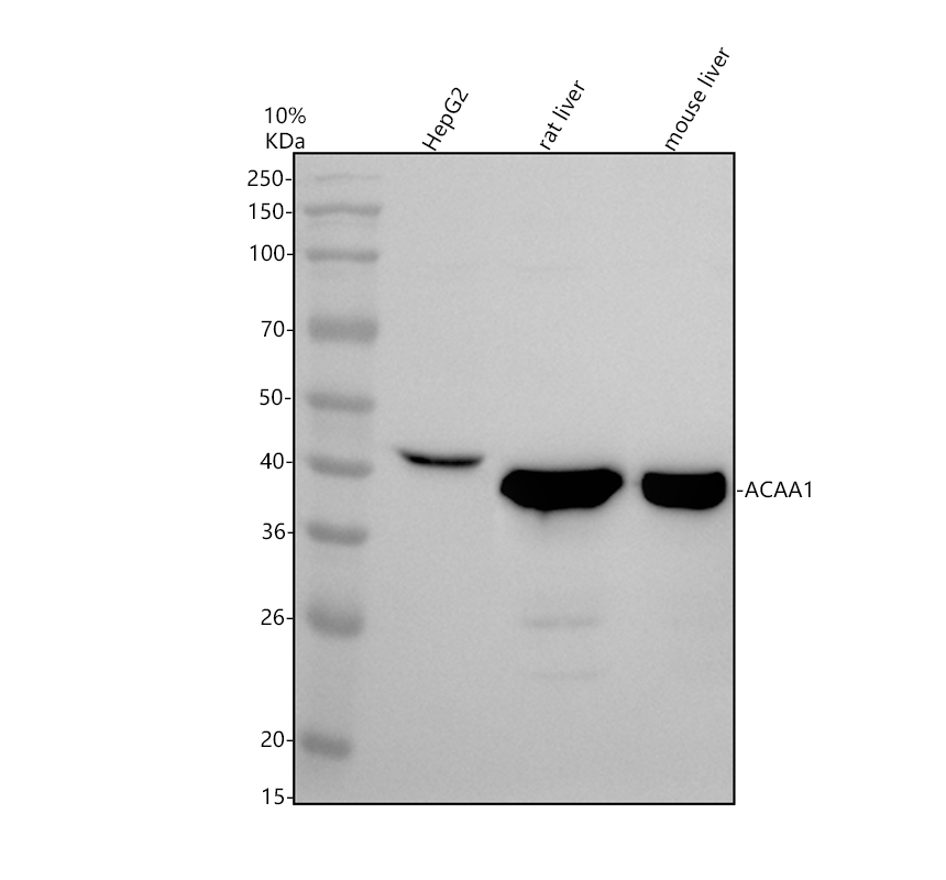 Western blot analysis of ACAA1 using anti-ACAA1 antibody (A07559-4). The sample well of each lane was loaded with 30 ug of sample under reducing conditions.