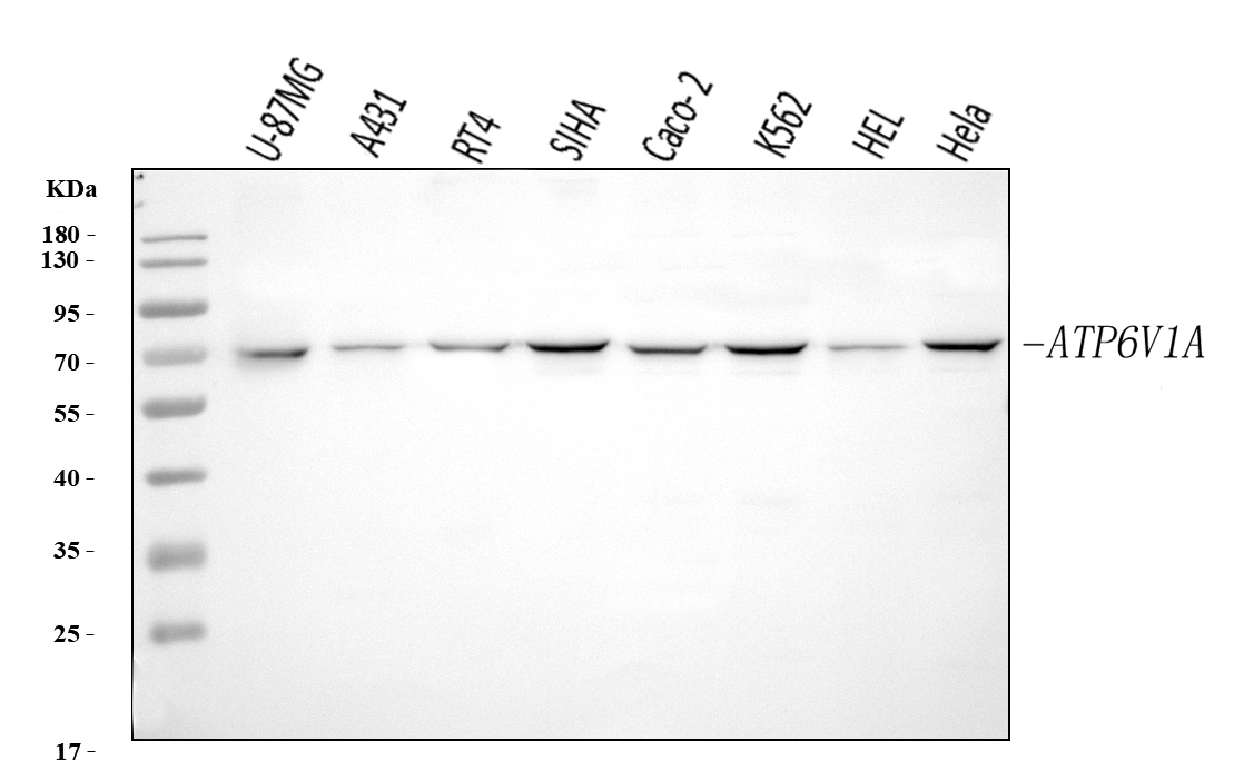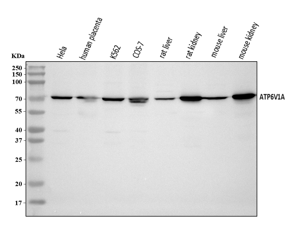 Western blot analysis of ATP6V1A using anti-ATP6V1A antibody (A10401-2). The sample well of each lane was loaded with 30 ug of sample under reducing conditions.